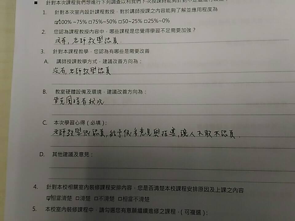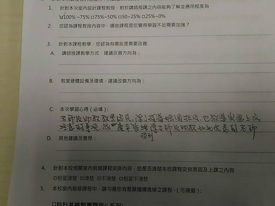 當然,今年的證照考試在閱卷方面,我認為主辦單位給予考生許多的寬容,在某些層面上這代表了證照考試愈來愈趨向於正常化,我也認為這會大大影響了後續證照考試的趨勢。但不論如何,我認為既然要從事室內設計,就該有熱情就該有實力,真心誠意的為客戶設計符合需求的項目,品格及作品都要提升,不要被大眾認為設計師都在欺騙,只想賺錢。我也認為設立隨堂助教系統是正確的,只要是對學生有幫助的事情,就算我多花費資源,都是非常願意的。