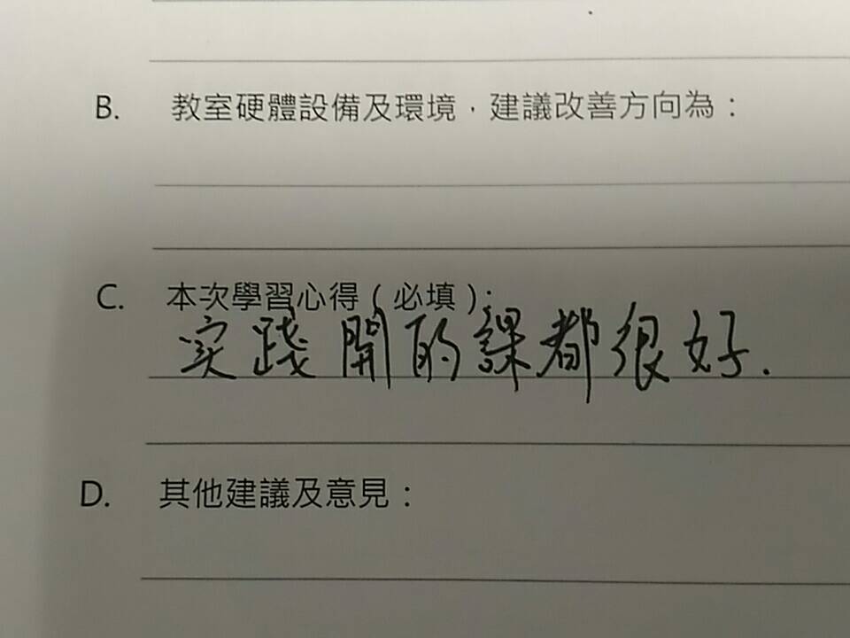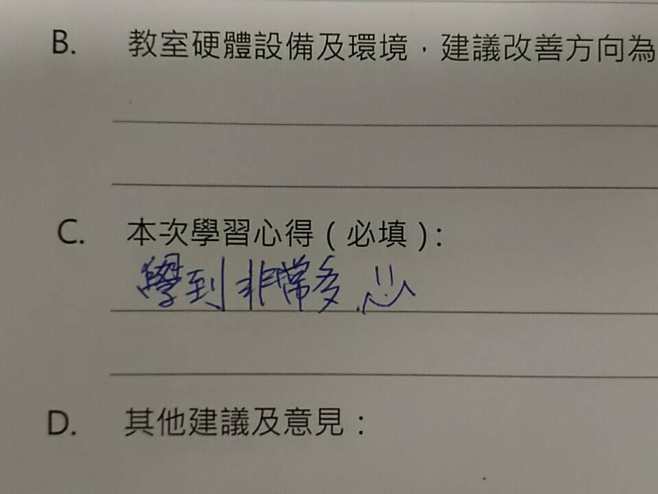 這次學到了很多東西,老師們都超厲害,照顧學生超用心,非常感謝老師們的教導。