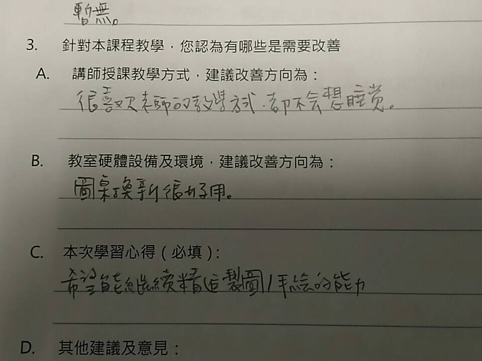 覺得課程學習得很紮實,不管是繪圖,還是實務面,都有一定的理解,所以認為在這裡上課很不錯,學習很多。