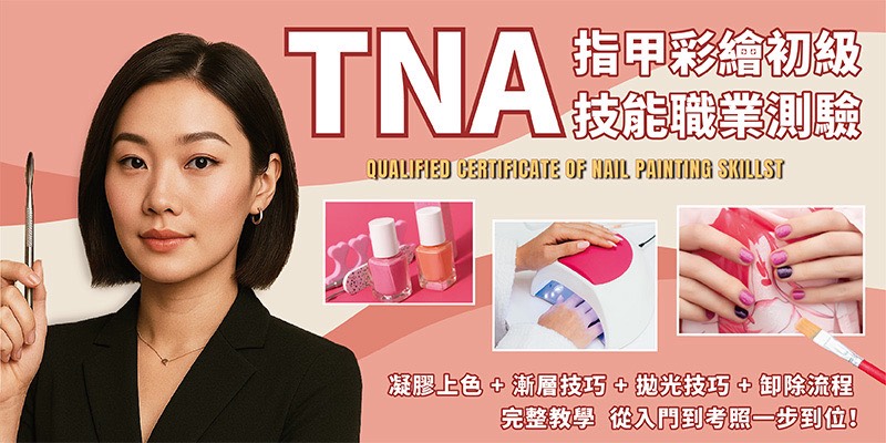 國家級證照|TNA指甲彩繪初級技能職類測驗班美甲是女人的第二張臉,健康美麗的指甲讓整體大大加分。天然環保無臭無味的凝膠指甲 在沙龍市場上相當受歡迎,80%顧客有固定消費習慣。本課程以輔導考取指甲彩繪職類初級技能測驗(證書效力等同國家檢定丙級)為出發點而設計的美甲師創業課程。內容涵蓋深廣,包含消毒與衛生、指甲構造生理學、凝膠產品使用、色彩學、美甲專業技巧…等, 培養具有獨立作業能力的專業美甲師。