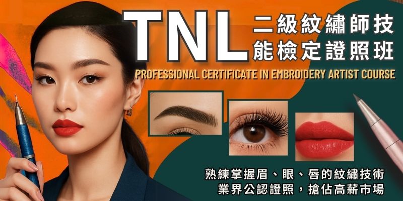 TNL二級紋繡師技能檢定證照班-模擬考試+眉眼唇實操本課程以注重消毒衛生出發,針對皮膚生理學、色彩學、工具學、潮流設計都有重點式的講解。透過實際示範操作,了解工具的使用方式、各種膚質、膚色、臉型應如何操作、色彩選用及設計適合的樣式,包含輔導考取TNL二級紋繡師証照。只要依照講解步驟重覆練習,即使是新手也能零時差學習,獲得最精準的操作技能。 透過老師分享多年來自家美容工作室經驗,紋繡沙龍創業經營模式、設備到產品的規劃、訂價到售後服務的設計及常碰到的問題…等,讓你避開冤枉路,創業起步不困難 !