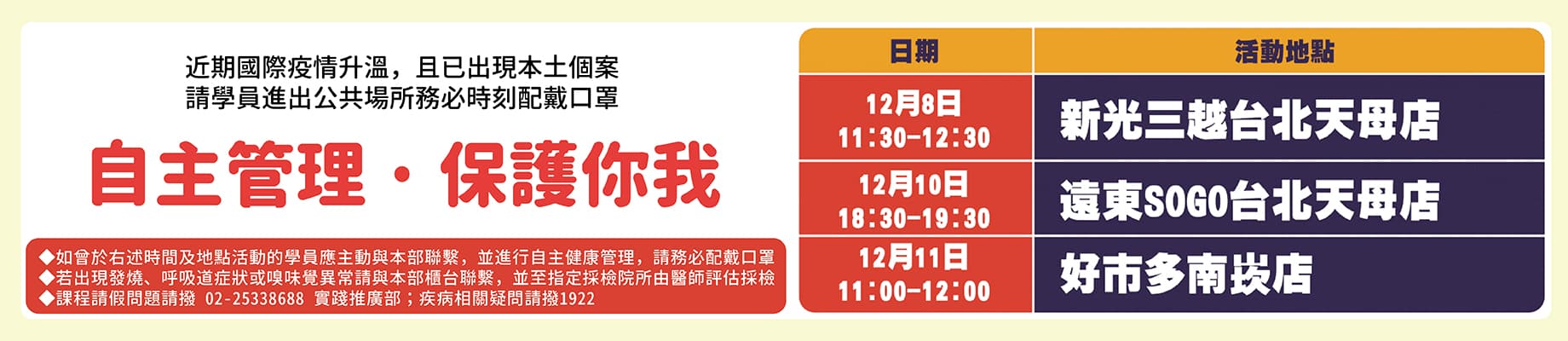 國際疫情升溫又見台灣的本土案例,如學員有曾經到過疫調足跡路徑,請學員務必來電通知承辦人員或櫃檯,並做好自主健康管理。
