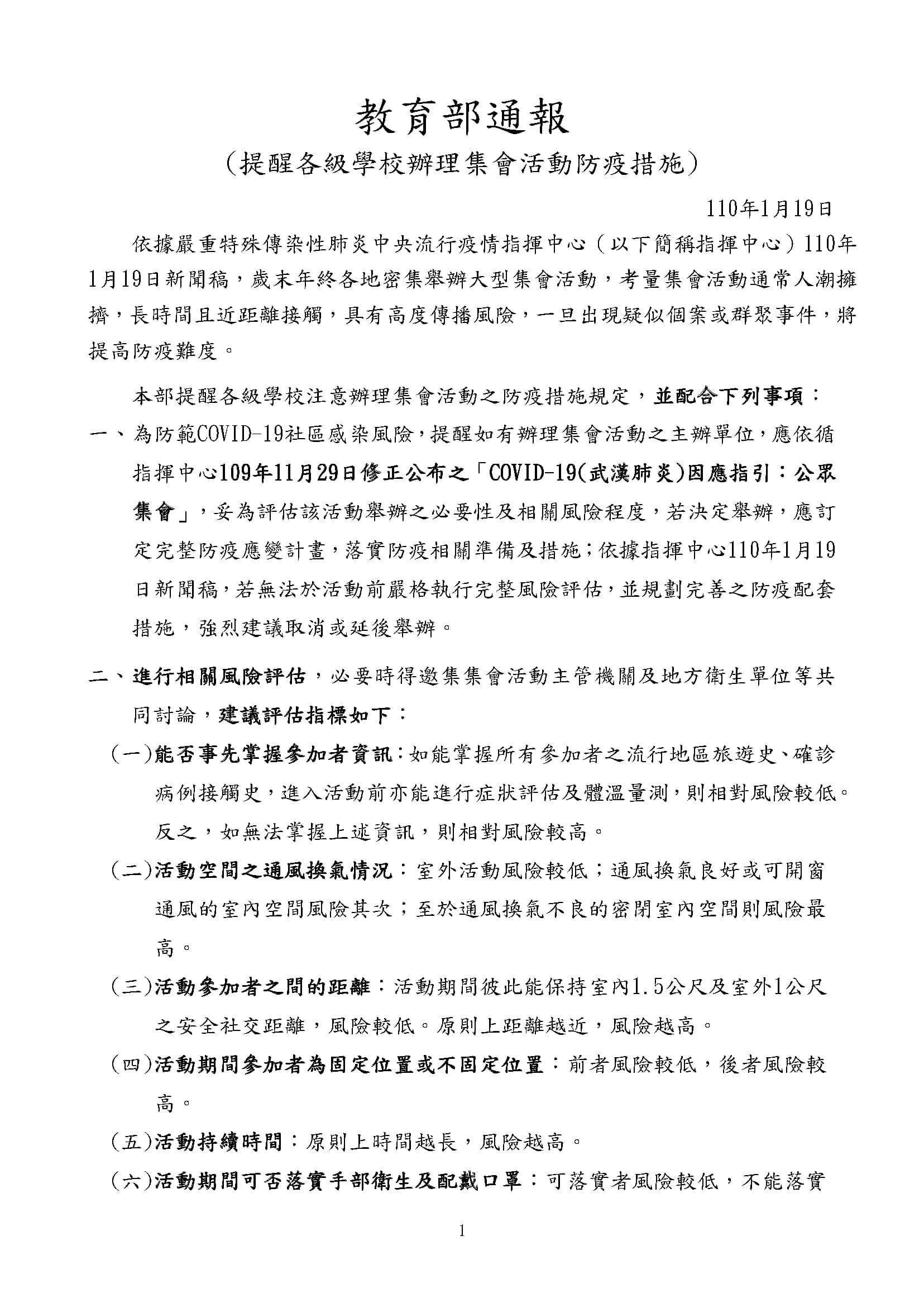 110.01.19教育部通報:提醒各級學校集會活動辦理及校園防疫措施