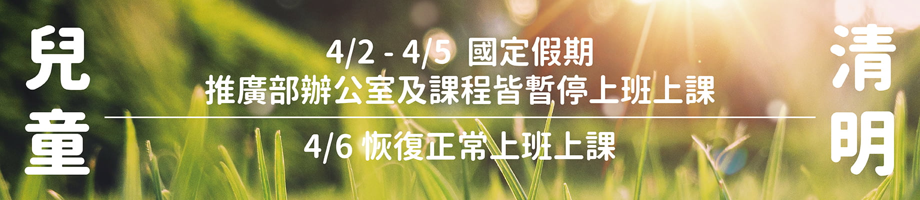 4/2 至 4/5 為兒童節暨清明國定連續假期,推廣部辦公室及各課程皆停止上班上課。