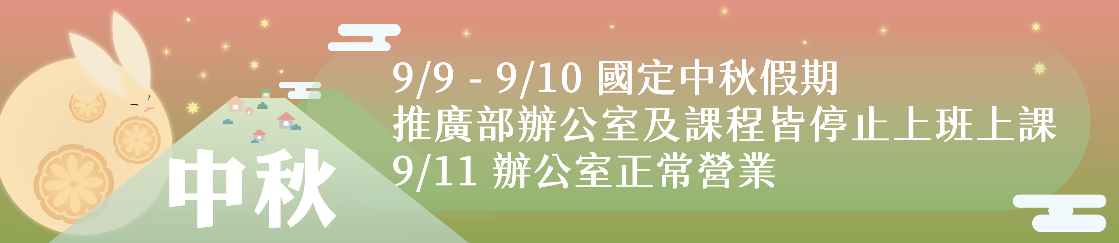 9/9-9/10為國定中秋假期,推廣部辦公室及課程皆停止上班上課。