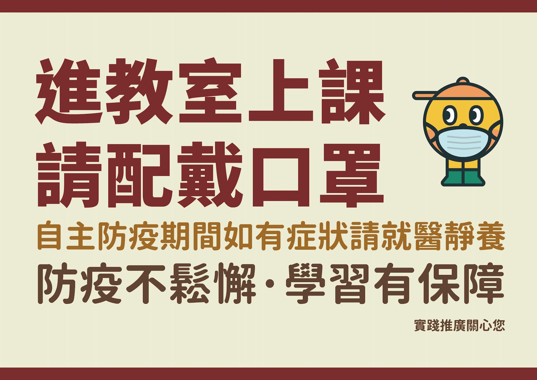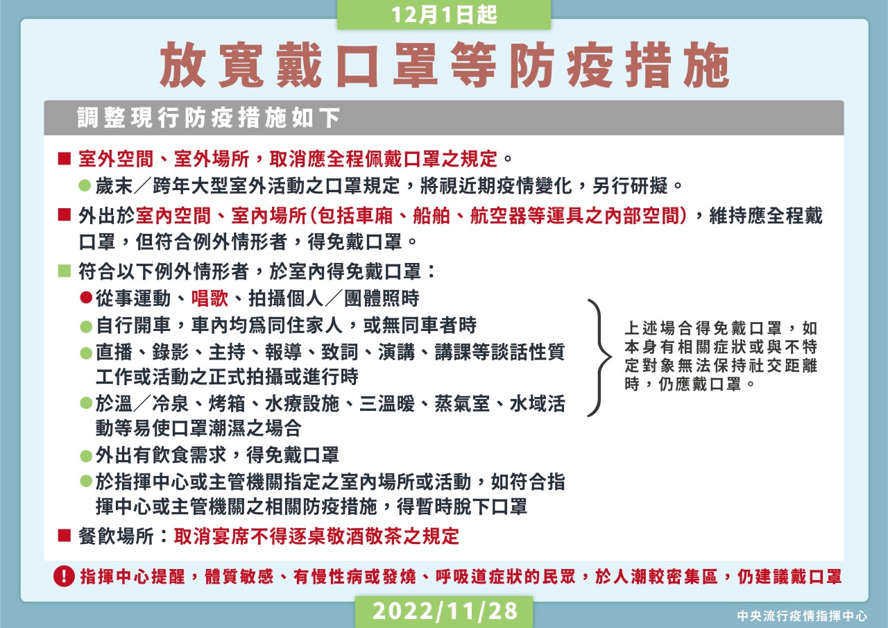 於室內空間(室內場所),維持應全程佩戴口罩,但如屬致詞、演講、講課、拍攝個人/團體照或進行運動、歌唱、音樂吹奏、合奏、舞蹈類之課程及教學活動等時,可以不戴口罩,但於課程開始前及結束後,仍須佩戴口罩。